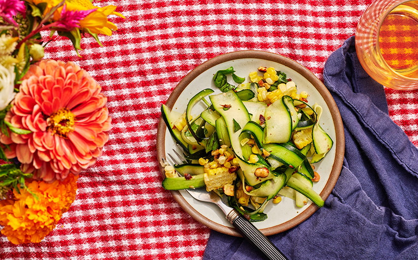 Though the formula is relatively straightforward, there is still a lot of versatility in how you prepare the veg (shaved, sliced, roasted, boiled, pickled) and what you choose to pair it with, making an infinite array of options. Here I opt for tender, raw, shaved zucchini as the star of the dish paired with sweet corn, scallions, basil, lemon juice, local hazelnuts and a salty crumbly cheese to bring it all together.