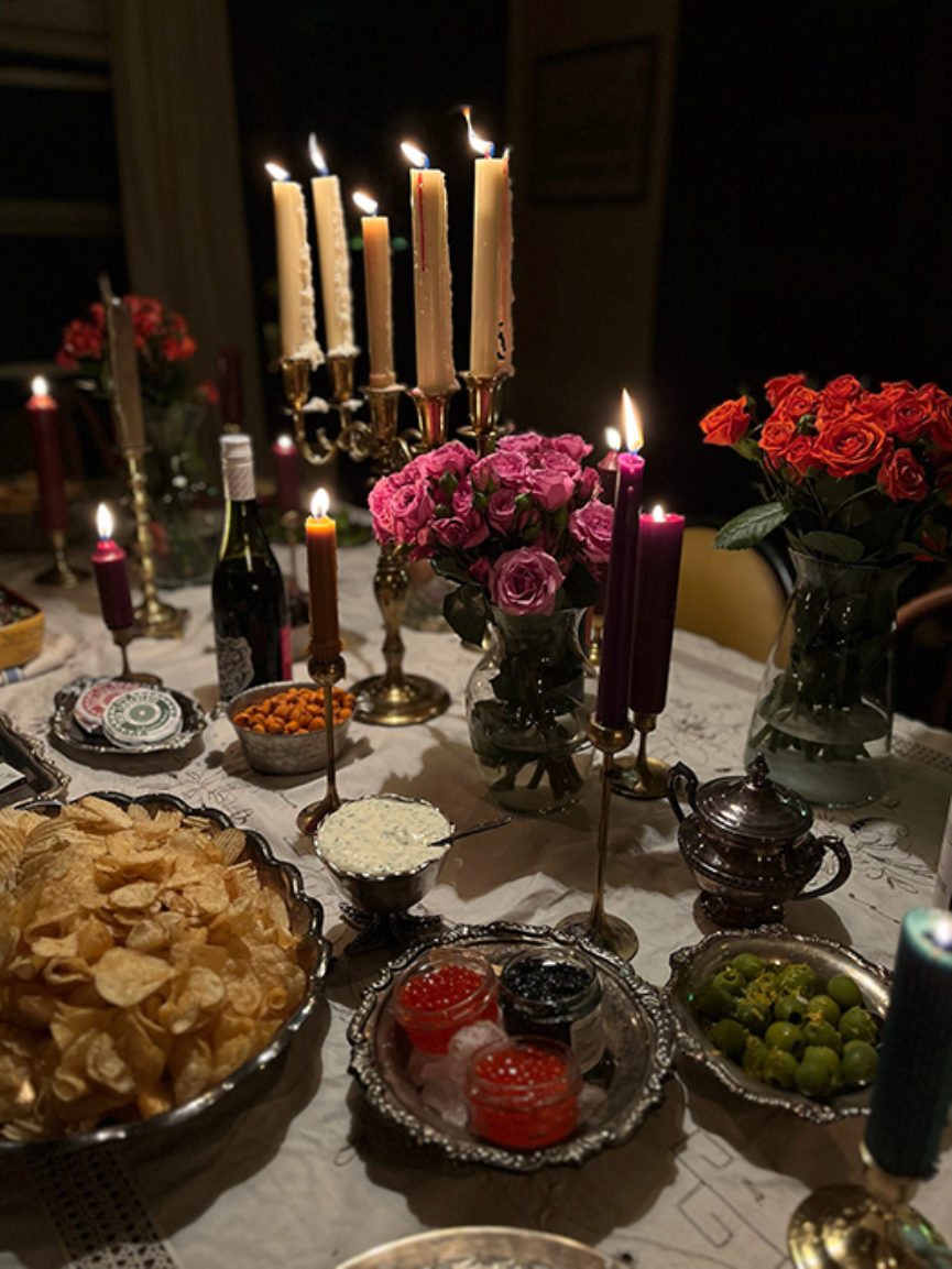 1. Use lots of tapered candles—it makes a space feel comfy and cozy. Grab a mix of colors and heights. Crystal candleholders help add flair. Hageman and Sherman find theirs at thrift stores.