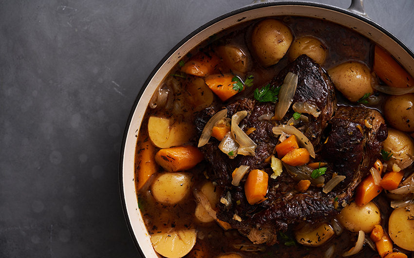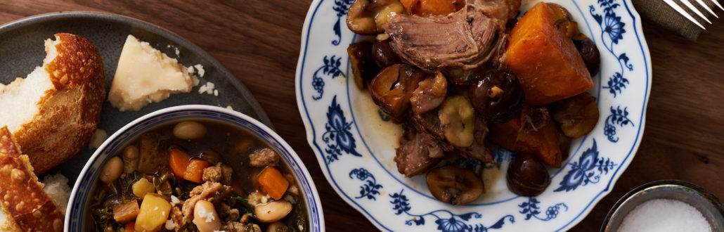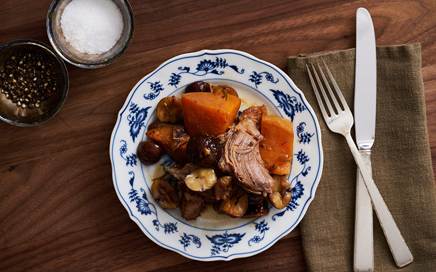 Chestnuts and sweet potatoes bring an unusual, yet festive twist to this slowly braised roast. A little sweet, a little nutty and endlessly tender, it’s a winter meal worthy of dinner guests—or perhaps even a holiday table. Cliff Gonyer makes this meal frequently each winter, and likes to enjoy it with a medium-bodied Côtes du Rhône wine.