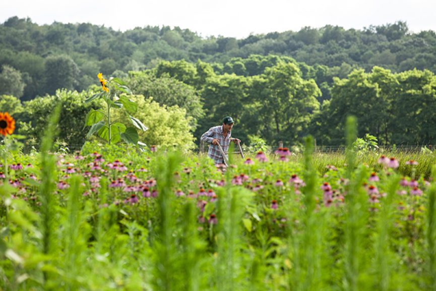 At Sacred Blossom Farm, Tony DiMaggio grows and harvests herbs: fragrant tulsi interplanted with red clovers, wild stinging nettles foraged from surrounding woods, ashwagandha with roots growing deep into the soil. He harvests with the help of his team. That is, a few employees, including neighboring farmers who join during their own slow season, and two very happy dogs.