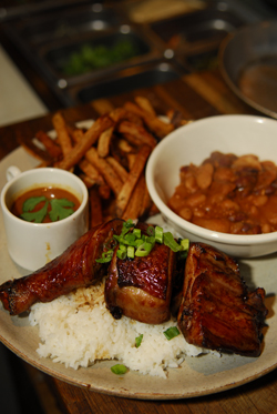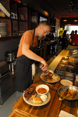 If you’re not paying attention when you’re walking down King Street in Madison, you might stroll right past The Haze. With a simple, black exterior and their name stenciled with spray paint on the window, The Haze might be inconspicuous, but you’d be hard pressed to miss the restaurant’s positively funky spirit. As you enter the dimly lit space, you’re greeted by the friendly staff and the aroma of slowly roasting meat—and you feel right at home. A collaboration between owners Shinji Muramoto, Justin Carlisle (formerly at Harvest) and his wife Cory, and Daniel Almquist (formerly at Lombardino’s), The Haze is an undoubtedly experimental yet easy spot to unwind, kick back with a beer, and enjoy a pound or two (yes—“or two”) of classic American BBQ ribs or a plate of Banh Mi with a side of edamame and fries. Chef Sean Gartlan is the driving force in the kitchen, running The Haze’s custom smoker and tirelessly dishing up plate after plate of delicious BBQ. Their unique menu sports choice local ingredients from sustainable and/or organic farm sources like Driftless Organics (Soldiers Grove), Black Earth Meats (Black Earth), Otter Creek Organics (Baraboo) and Cates Family Farm (Spring Green), among others.