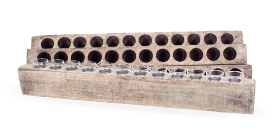 Centerpieces: Remember to keep it simple, especially when serving family style. Let your food be the star. Try an uncomplicated vase, like the ones below, filled with greenery or a flower or two. The sugar molds (wood item below) only need tea lights added to the glass inserts. No matter what you do, have fun with it!