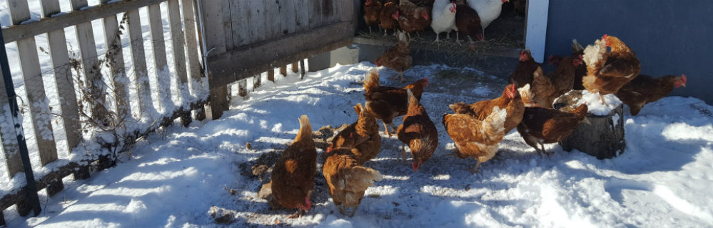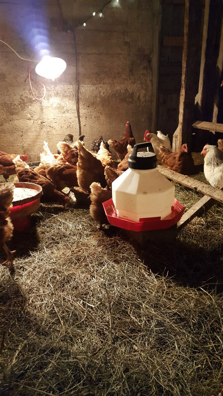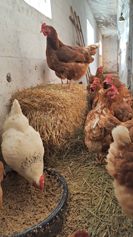 The next three considerations – shelter, food, water – are the same no matter the season. Yet winter brings added challenges to chicken care. I provide a cozy shelter that protects them from cold and predators, with access to electricity to create the daylight of a summer day needed for laying. I staple clear plastic to “lower” the ceiling, keeping heat where the hens are roosting. This also helps manage wild birds and the mites they can bring into winter barns. I use chicken guru Joel Salatin’s deep bedding solution – thick straw added throughout the winter providing dry footing and natural heat from slow decomposition at the ground level.