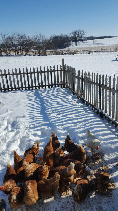 Fresh water is a basic item but can be challenging on very cold days. I use heated water containers and keep these filled. I also bring in warm water and milk every morning. In the middle of the winter, I also add probiotics to their water to help maintain their feathers and overall health.
